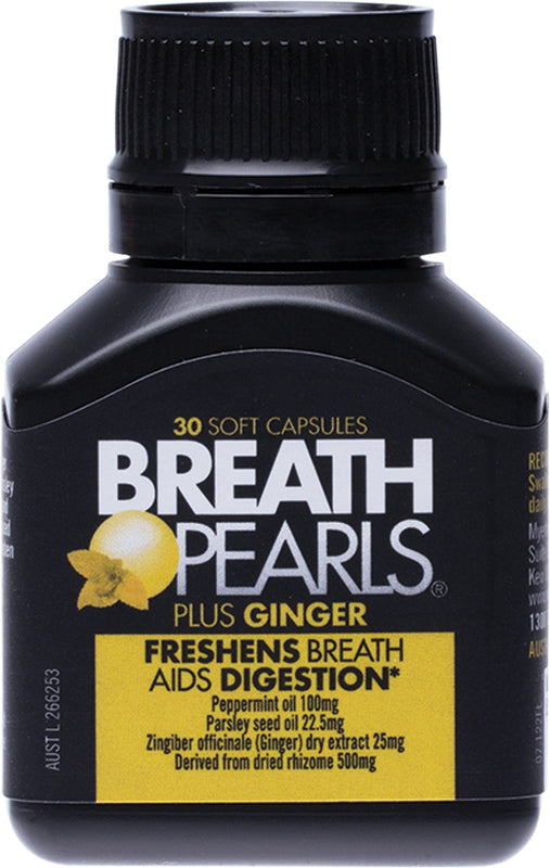 DescriptionBREATH PEARLS Breath Freshener Plus Ginger IngredientsPeppermint Oil 100mg, Parsley Seed Oil 22.5mg, extract equivalent to dry zinger officinale (Ginger) 500mg.